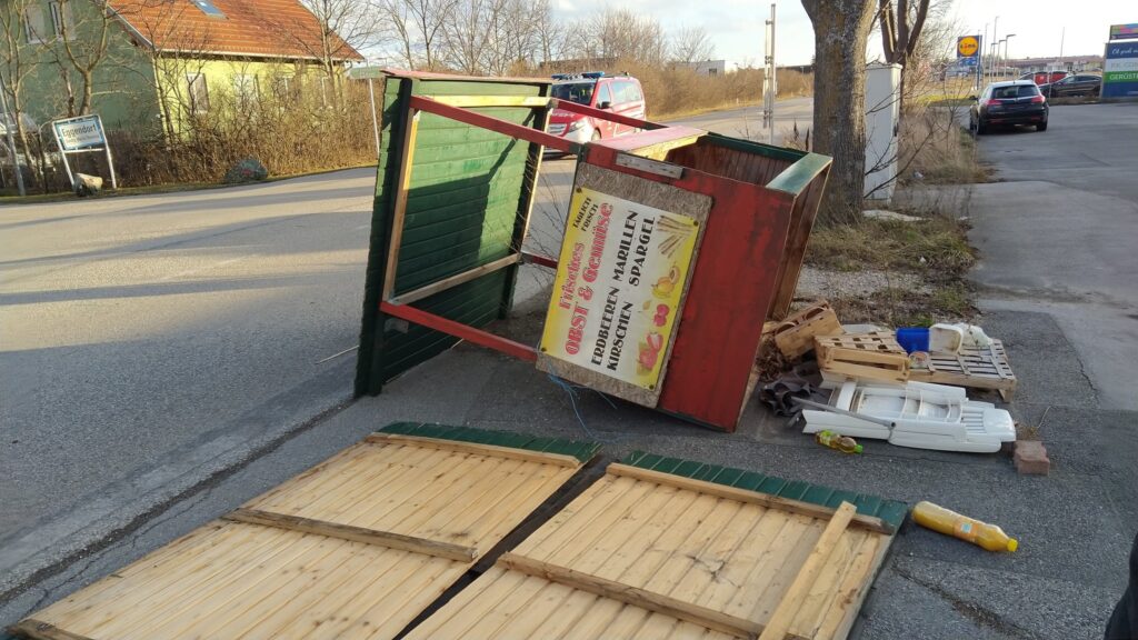 Ein Verkaufsstand, der am Rande der Wiener Neustädterstraße nächst einer Parkbucht aufgebaut war, hielt dem Sturm der letzten Stunden nicht stand und wurde umgeblasen. Am 19.02. um 16:05 Uhr traf die Alarmierung ein. Die Hütte bzw. deren Teile, die sich gelöst hatten, wurden etwas abseits der Fahrbahn abgelegt, sodass keine weitere Gefährdung für Personen bzw. […]