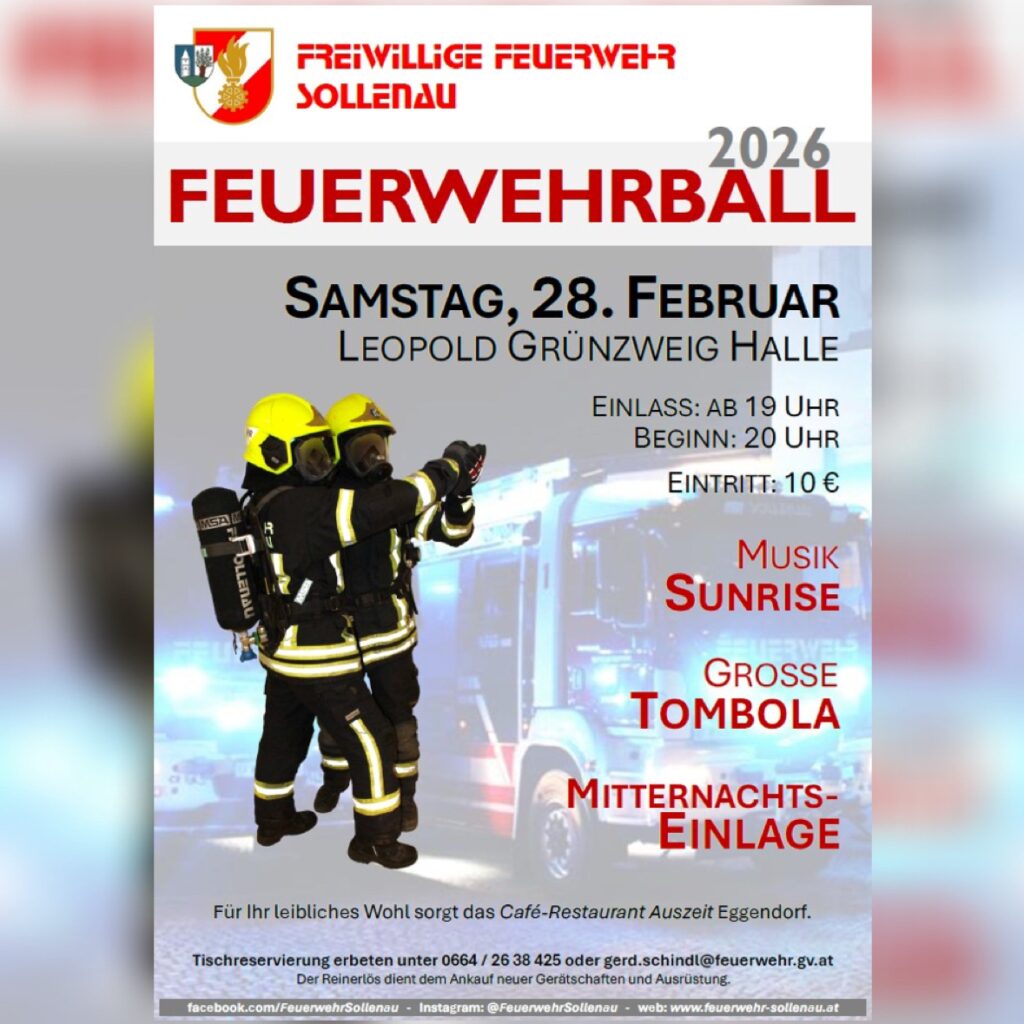 Wir freuen uns, mit euch in die Ballsaison 2026 zu starten und laden ein zum diesjährigen Feuerwehrball am Samstag, 28.02.2026, ab 19:00 Uhr in der Leopold Grünzweig Halle in Sollenau.